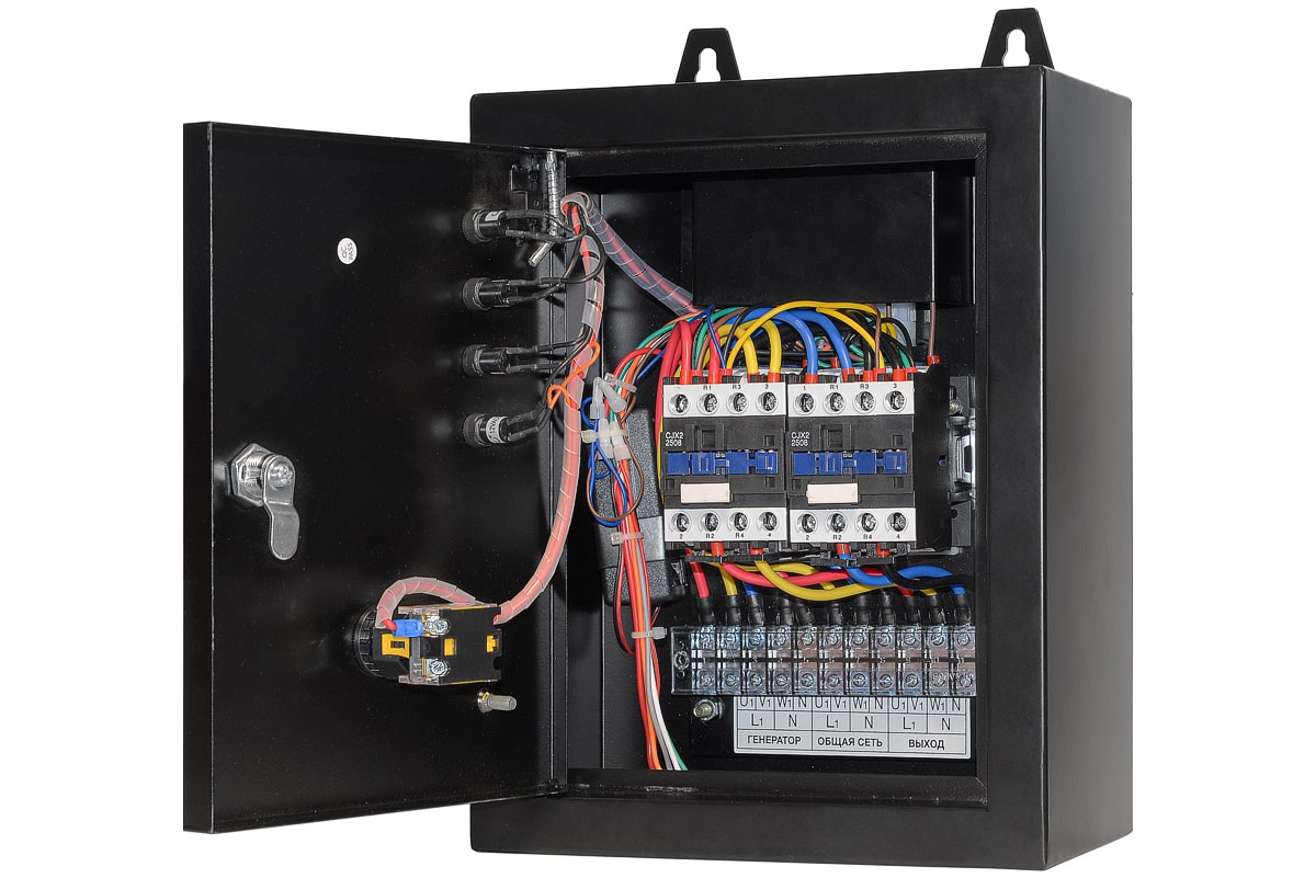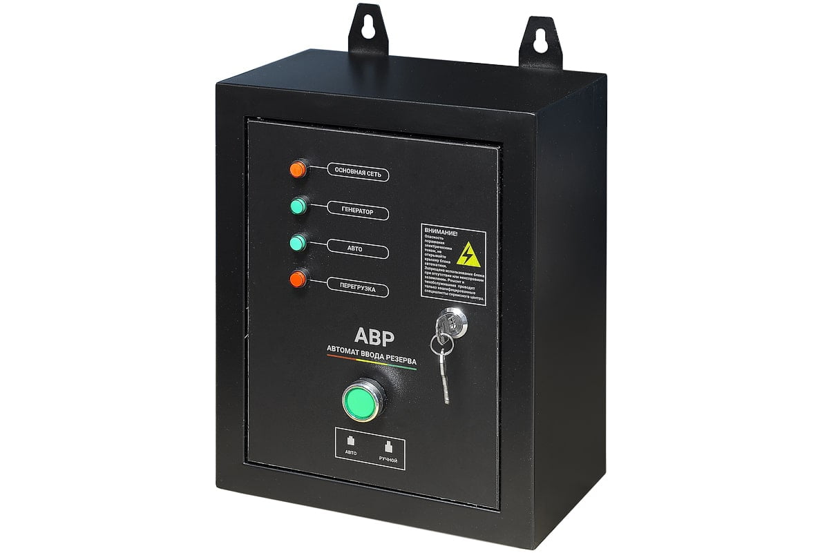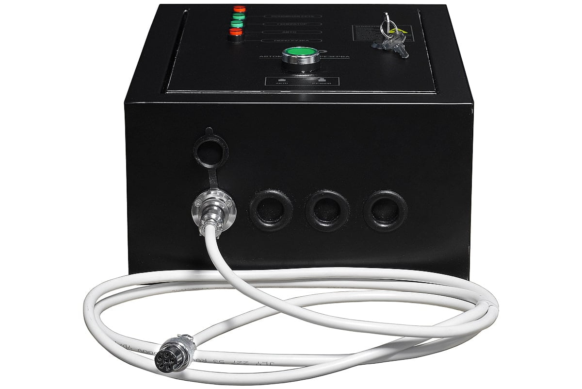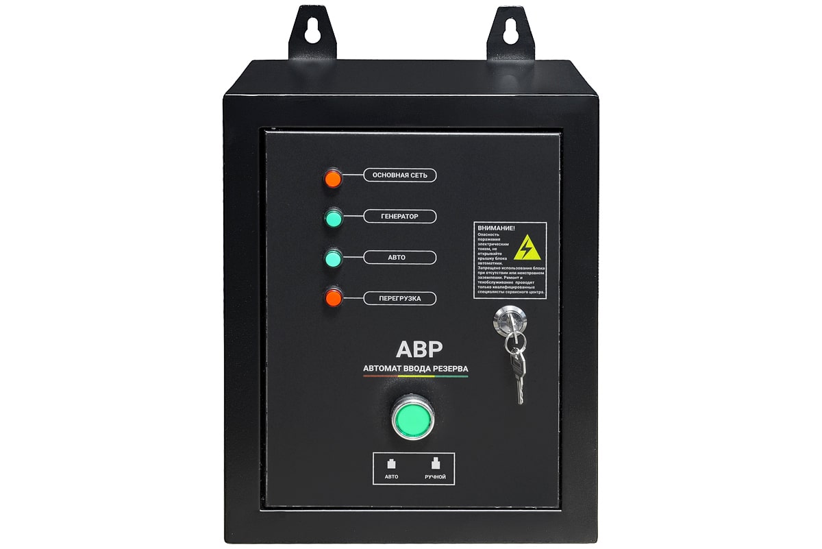 Блок АВР для дизельных генераторов однофазных и трехфазных от 5 до 9 кВт, включает в себя систему автозапуска (автоматического ввода резервного электропитания). При появлении основного источника электропитания происходит отключение электростанции. Блок автоматического управления для контроля наличия напряжения в сети.