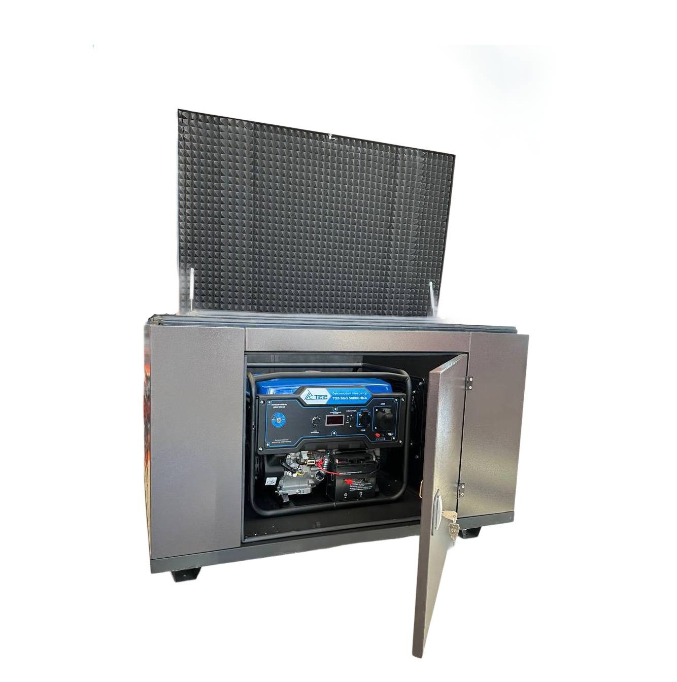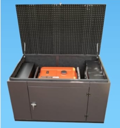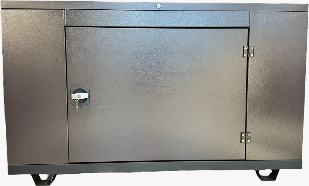 Кожух для генератора имеет доступ к устройству для заправки и обслуживания с трех сторон, изготовлен из оцинкованной стали толщиной 1,5 мм. со стойким покрытием. Кожух обеспечивает хорошее шумопоглощение благодаря специальному материалу обшивки стен. Оснащен промышленным вентилятором с двукратным объемом прокачиваемого воздуха, что гарантированно предотвращает перегрев генератора. Ввод кабелей производится через дно. Дверцы оснащены замком для защиты от посторонних.